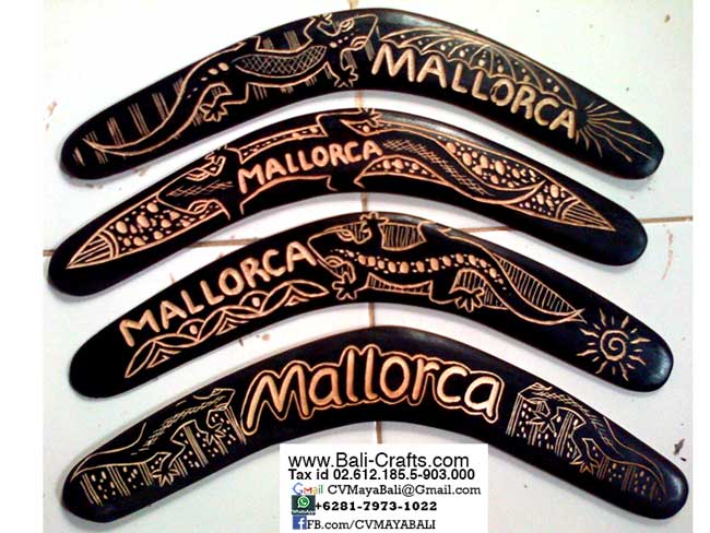 Carved Wood Boomerangs from Bali Indonesia with NameDrop. You’re welcome to add any namedrop to most of our products including these wooden boomerangs, either painted or carved free of charge or with tiny additional fee.